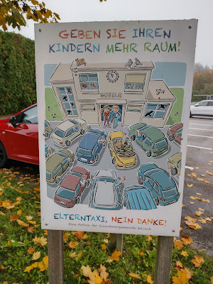 Valistuskyltti pienessä Selzachin kylässä Sveitsissä. Suomessakin voitaisiin ottaa siitä oppia. Ei autoilla tarvitse tunkea aivan päiväkodin tai koulun oven ääreen. Sopu sijaa antaa!